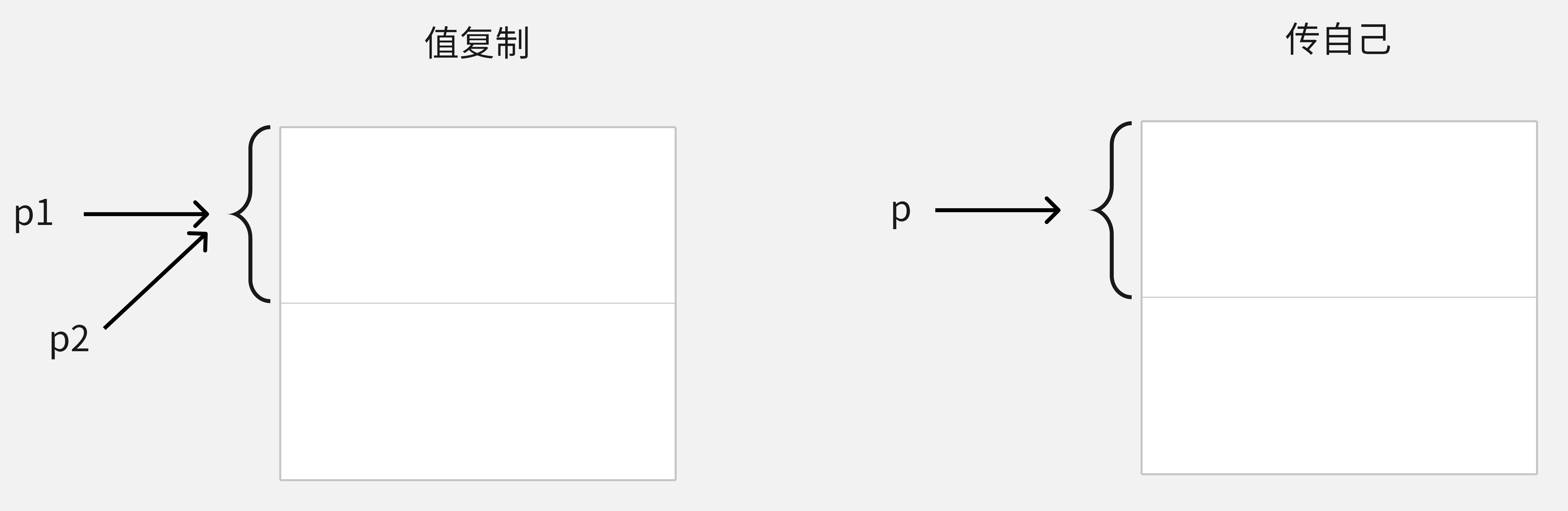 传指针有两种情况,第一种是值复制,第二种是传自己,如图所示。