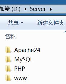 附一张全部搭建完后的Server文件夹的图,其中的PHP,MySQL,www文件夹会在后面创建。