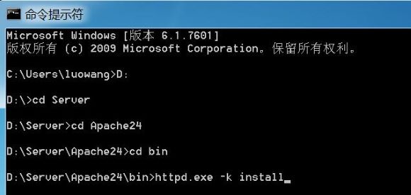 打开cmd,进入httpd.exe所在目录,输入httpd -k install安装服务。