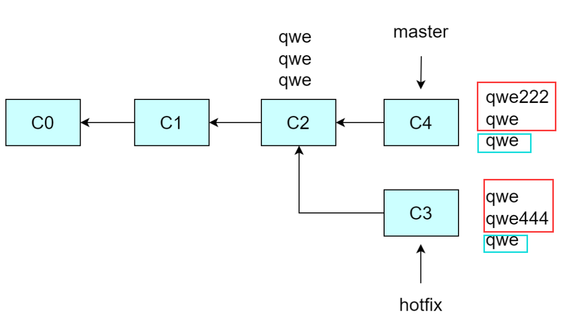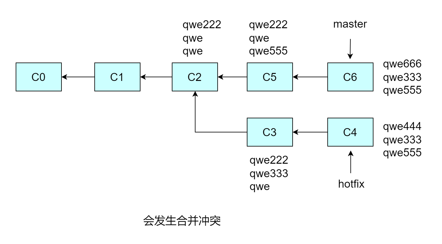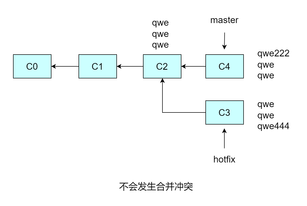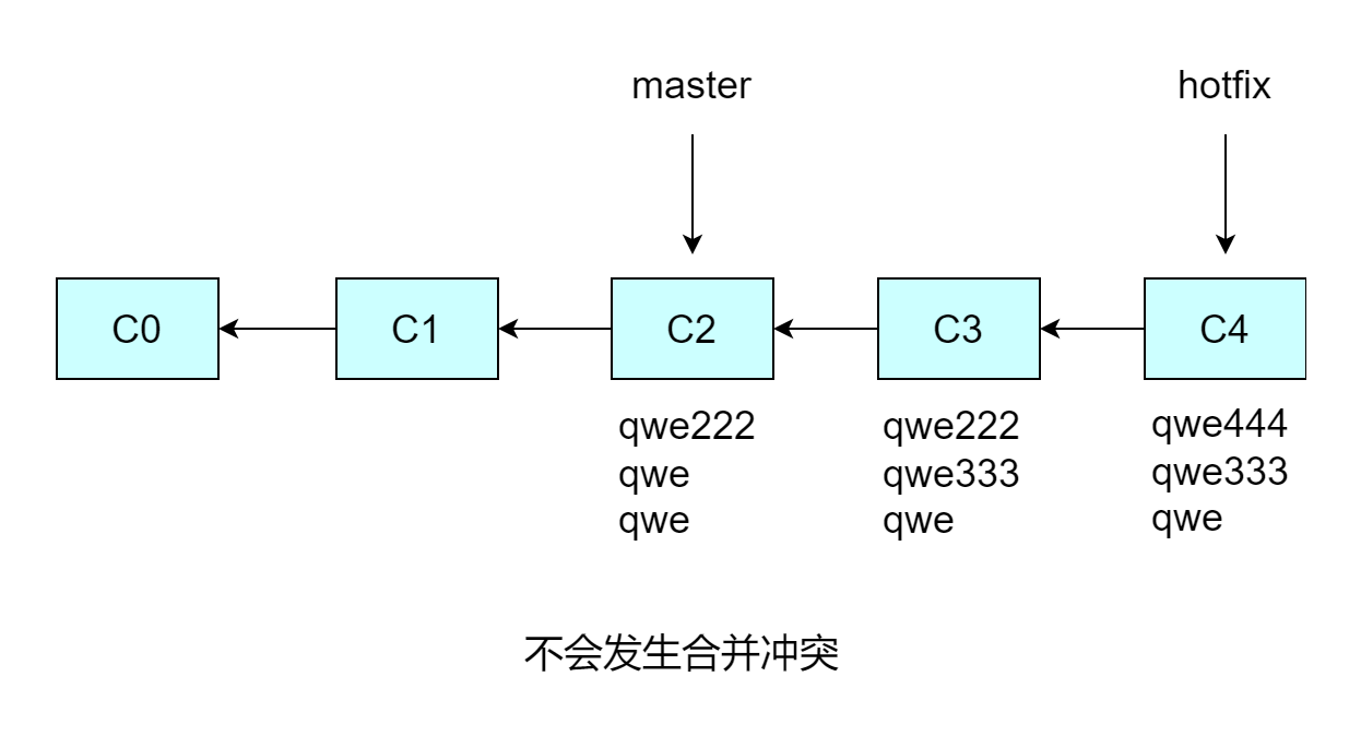 master对第一行做了修改,但hotfix没有对第一行做修改,无冲突;两分支都没有对第二行做修改,无冲突;master没有对第三行做修改,但hotfix对第三行做了修改,无冲突。最后合并成功,没有冲突。